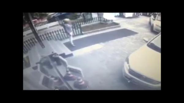 Женщина просто стояла на коврике, а автомобиль просто ехал. Причем на достаточном расстоянии, чтобы человек чувствовал себя в безопасности. Но, без травм, кажется, не обошлось.