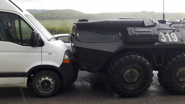 На автомобильной трассе «Симферополь-Феодосия» зафиксировано необычного характера дорожное происшествие. Установлено, что два бронетранспортерами зажали между собой микроавтобус. Снимки и видео - ролик ДТП выставлены на страницах социальной сети.